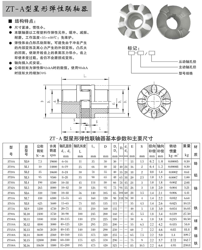 瑞安市寶德隆機(jī)械配件有限公司提供ZT-A型星形彈性聯(lián)軸器具有拆裝方便,快速安裝等特點(diǎn),廣泛用于連接/固定輪轂孔和零件的軸,例如齒輪,錐齒輪,鏈輪,葉輪,凸輪,皮帶輪和飛輪等軸的聯(lián)結(jié)固定,咨詢電話:18906872378